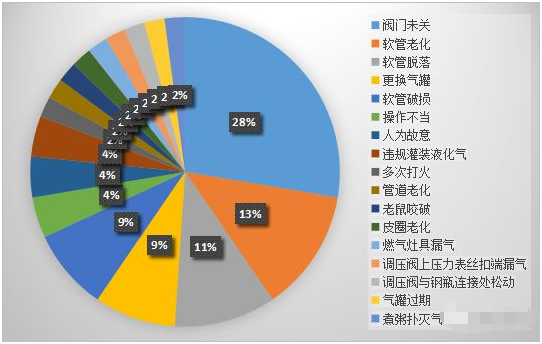 1)忘關(guān)或未完全關(guān)閉閥門是導(dǎo)致燃氣泄漏的首位,這從一定程度上反應(yīng)了燃氣用戶安全意識不足,燃氣常識不了解,燃氣安全宣傳仍需加強,日常使用燃氣要養(yǎng)成良好的習(xí)慣,及時關(guān)閉閥門。