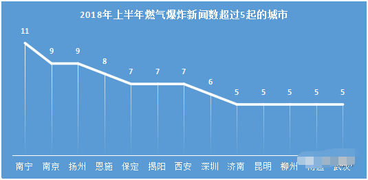 2018上半年,全國共有173個城市發(fā)生過燃氣泄漏或爆燃、爆炸新聞,其中共有13個城市新聞數(shù)超過5起,分別為:南寧、南京、揚州、恩施、保定、揭陽、西安、深圳、濟南、昆明、柳州、南通、武漢。