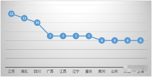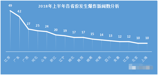 2018年上半年,全國共31個省份(包含港澳臺、直轄市及自治區(qū))發(fā)生過燃氣泄漏或爆燃、爆炸新聞,排名前十名的省份為:江蘇、廣東、廣西、河北、山東、浙江、遼寧、湖北、陜西、湖南。新聞數(shù)超過10起的省份如下: